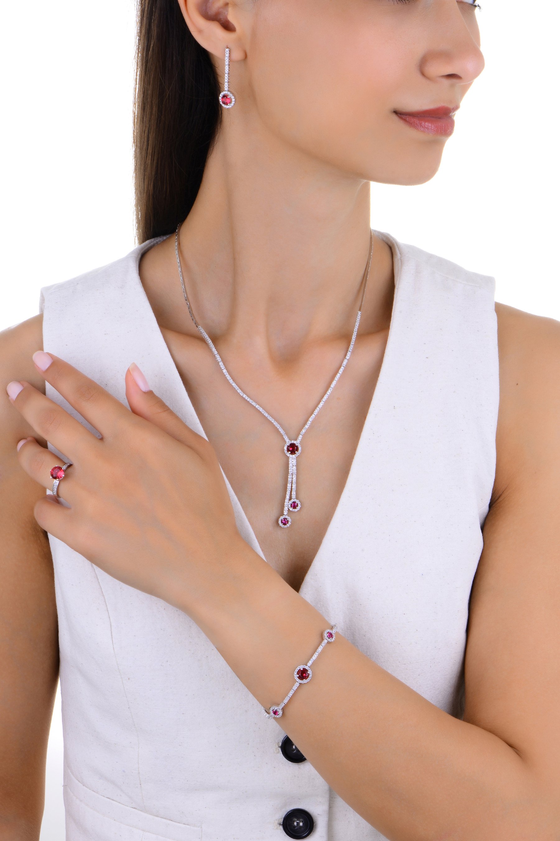 تألقي مع سحر الحب والعاطفة مع طقم الورود الحمراء الملكية المصنوع من أجود أنواع الفضة الإسترليني عيار 925 مع طلاء الروديوم النقي. تصميم عاطفي مستوحى من جمال الورود الحمراء الدامشقية، حيث تتوهج الأحجار الحمراء الكريستالية في إطار من الألماس الأبيض لتحاكي قطرات الندى على الورود وتضفي رومانسية آسرة على إطلالتك الملكية.